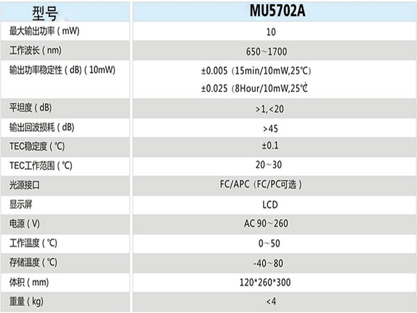 MU5702A單/雙波長高穩定度光源是采用蝶形激光器作為發光器件,通過獨特的自動光功率控制(APC)技術和自動溫度控制(ATC)技術,輸出功率穩定性高和波長穩定性好,多種波長組合,能滿足客戶多重需求,既可實現單一波長的輸出也可實現實現雙波長合波同時輸出。是測量衰減變化范圍大、要求功率和波長十分穩定條件下,科研和生產的理想儀表。廣泛用于光通信、光傳輸、光纖傳感等領域中的科研、生產和工程等領域。
